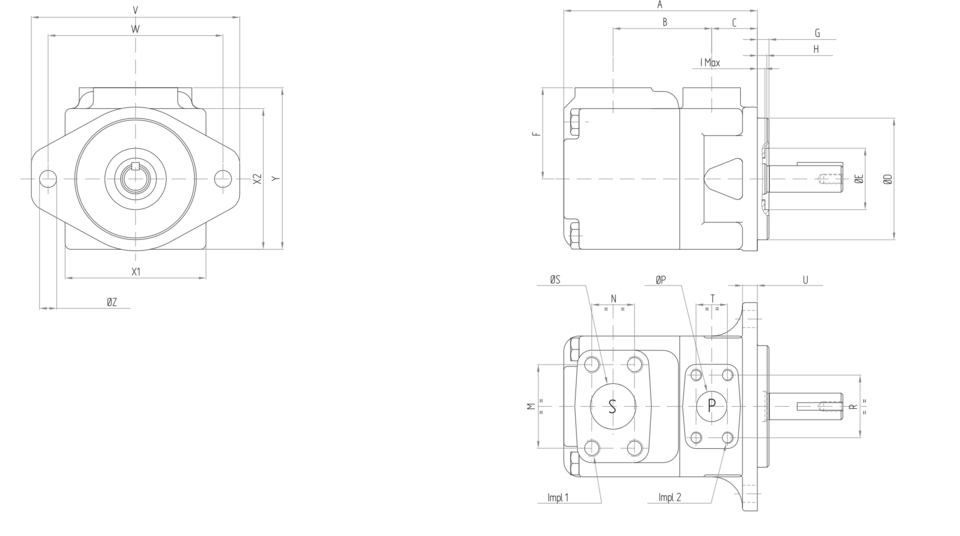 | A (mm) | B (mm) | C (mm) | ØD (mm) | ØE (mm) | F (mm) | G (mm) | H (mm) | I Max (mm) | M (mm) | N (mm) | ØP | R (mm) | ØS (mm) | T (mm) | U (mm) | Impl 1 | Impl 2 | W (mm) | V (mm) | X1 (mm) | X2 (mm) | Y (mm) | ØZ (mm) |