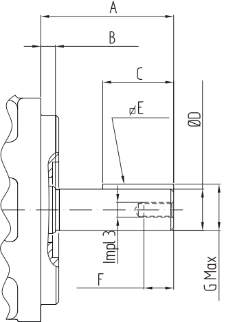 | A (mm) | B (mm) | C (mm) | ØD (mm) | E (mm) | F (mm) | G Max (mm) | Impl 3 |