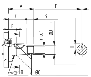 A mm (in) B mm (in) C mm (in) ØD mm (in) E mm (in) F mm (in) ØG mm (in) H mm (in) Impl 1